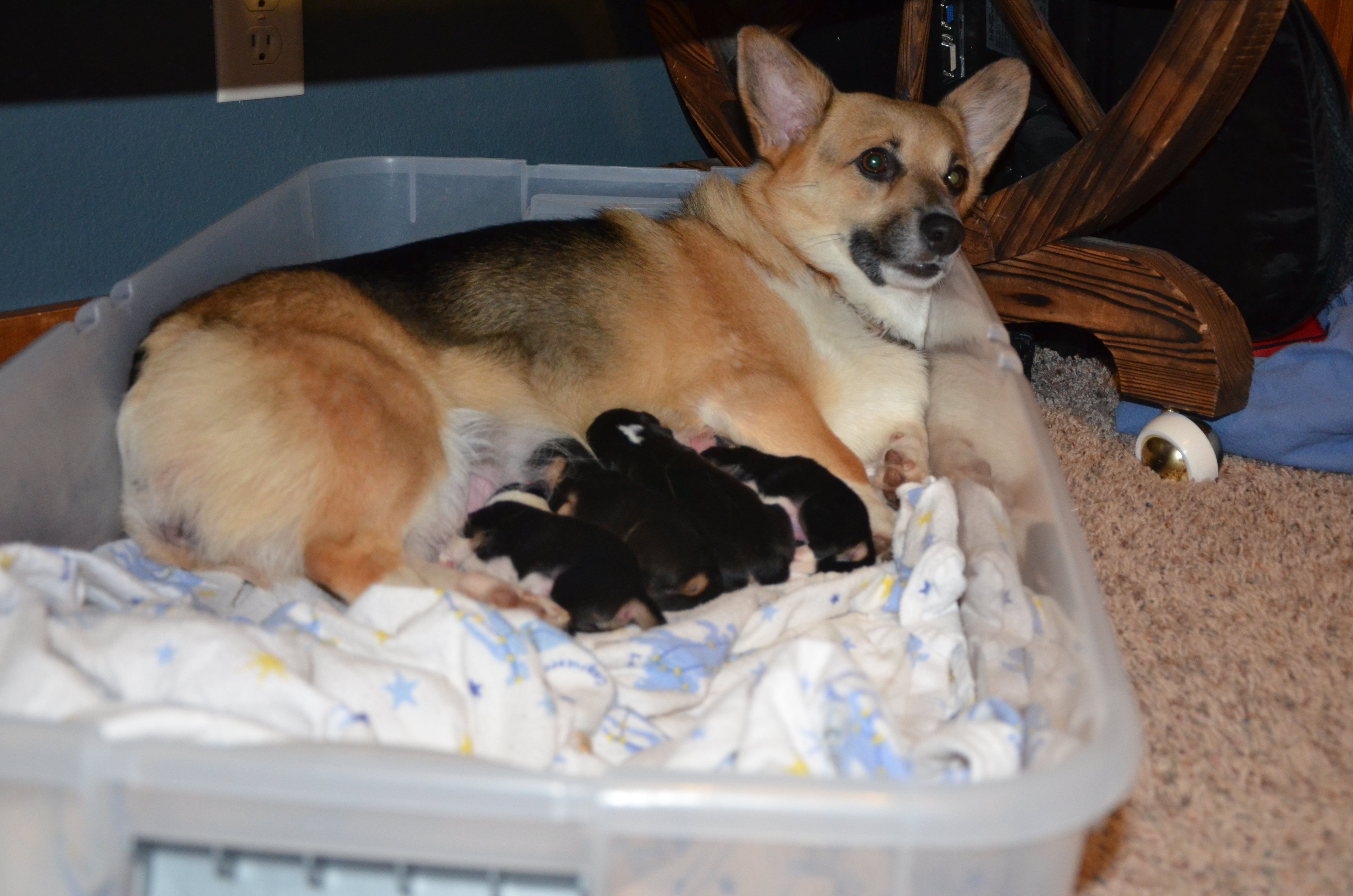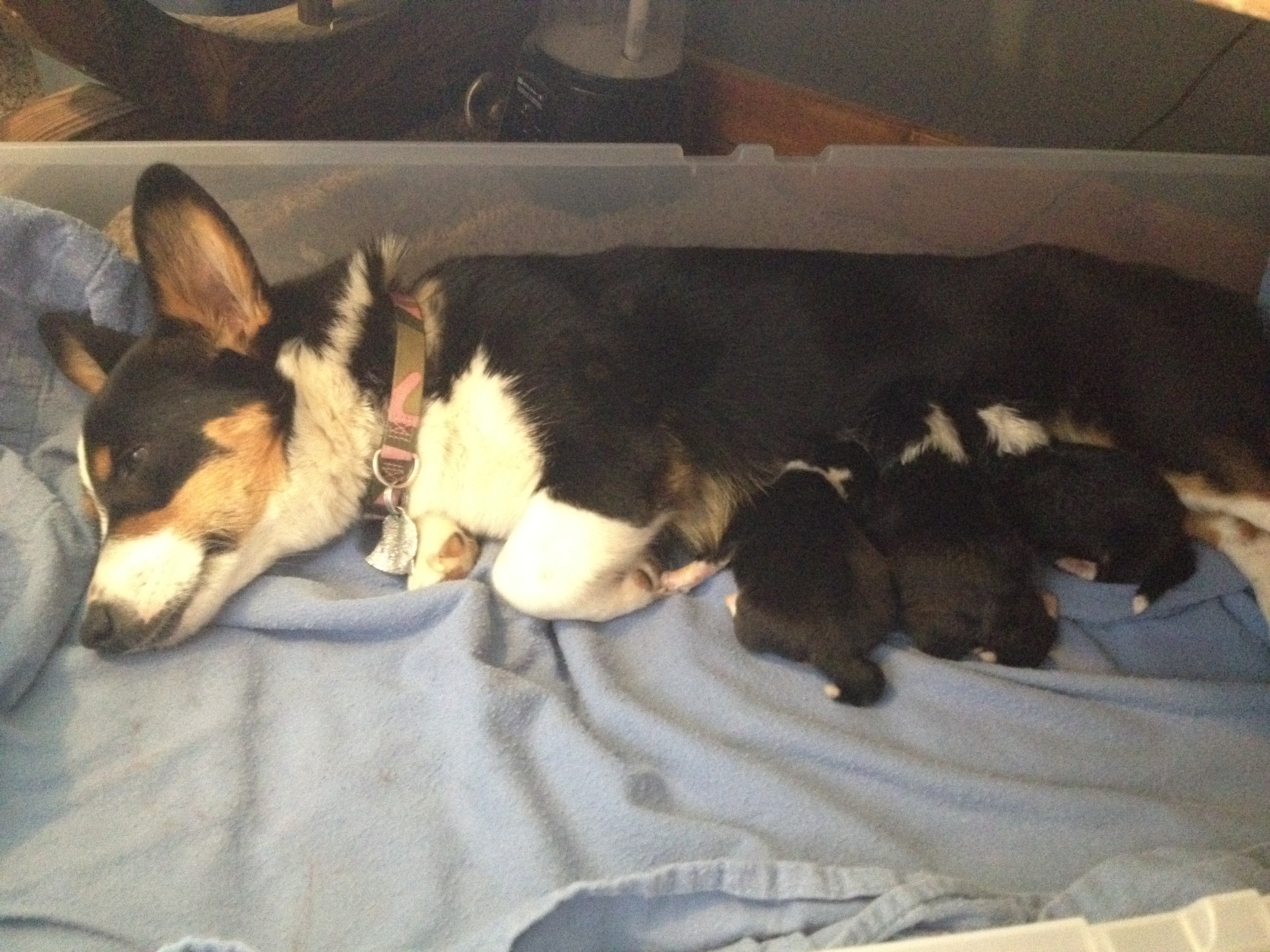 Late Sunday night/Monday morning, Lori’s litter was born. She had 5 pups, 3 boys and 2 girls.