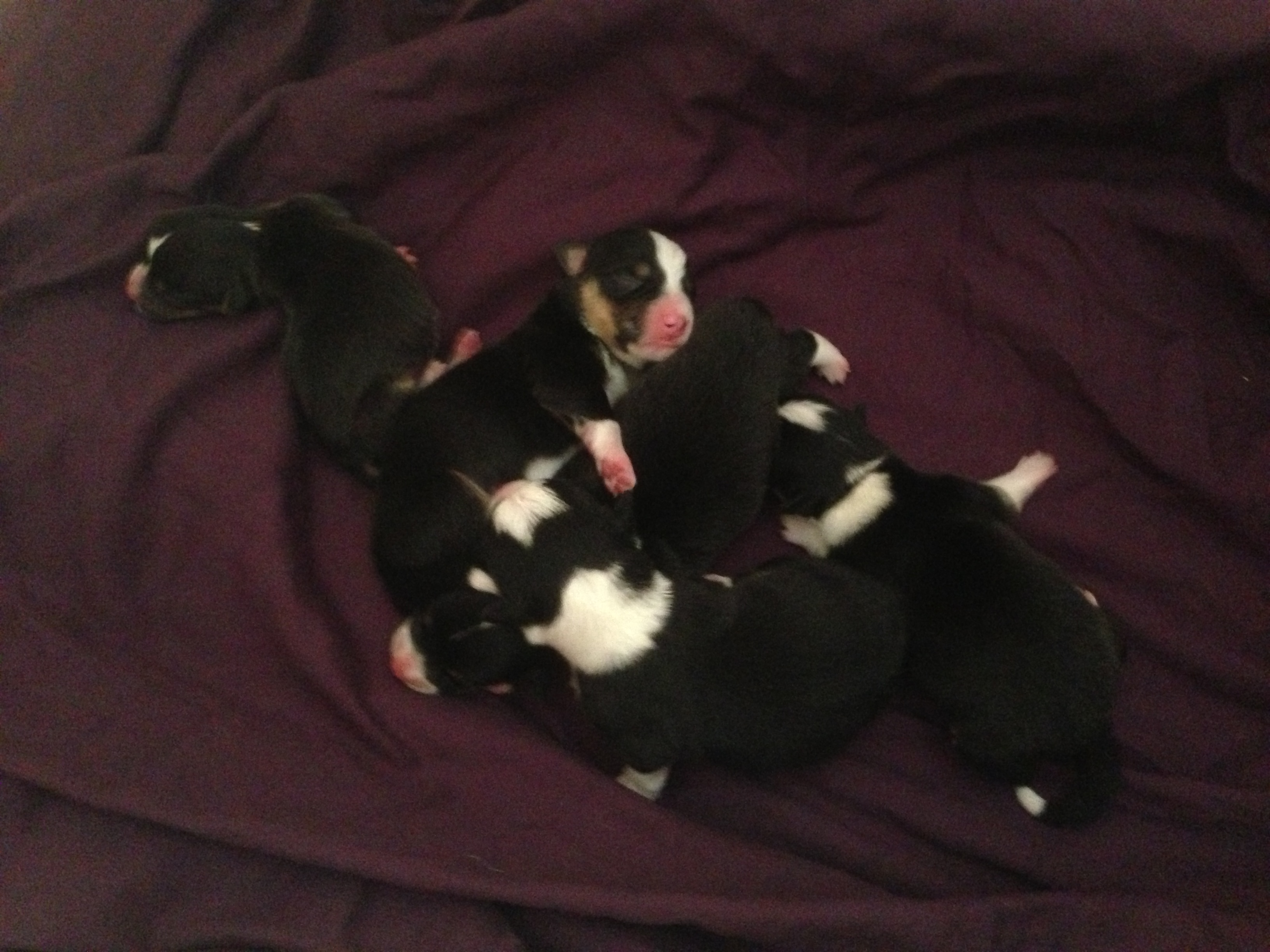 Clara’s litter is here. They were born on March 30th, the day before Easter. 3 boys and 3 girls. All doing really well.